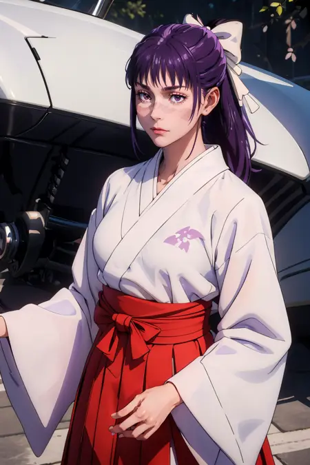 Outfit words: red hakama skirt, hair bow, white bow, wide sleeves, white kimono, long sleeves