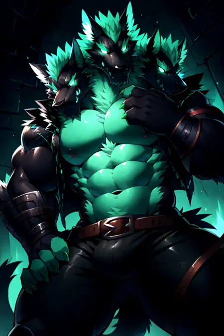 근육질 남성, 녹색 몸체, 녹색 눈, 빛나는 눈, 송곳니, 발톱, 꼬리, 뱀 꼬리, 혀를 내밀음, 하의, 옷 입음, 벌어진 상의, 벌어진 상의, 3개의 머리, 검은 몸체, 두개골