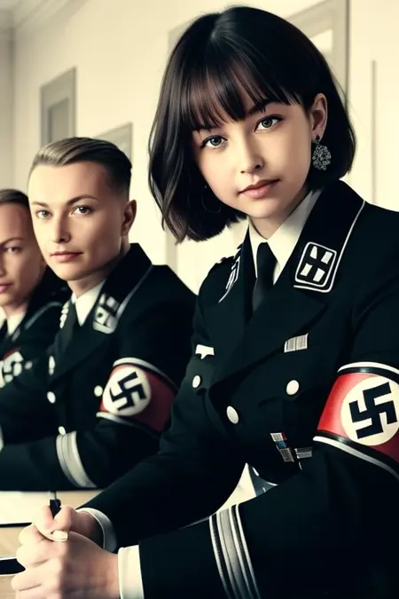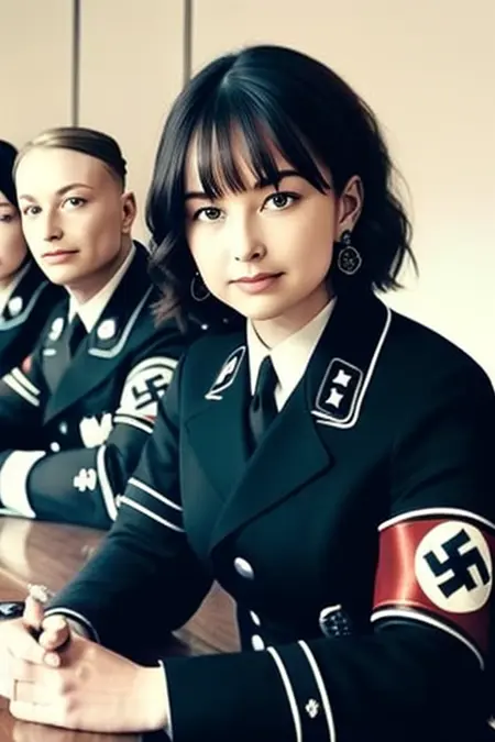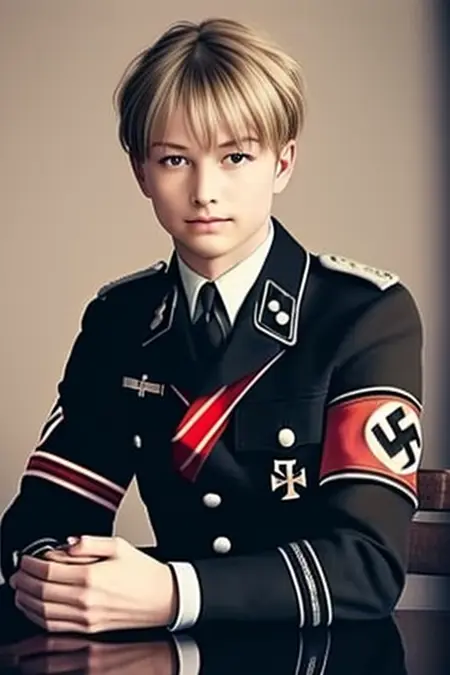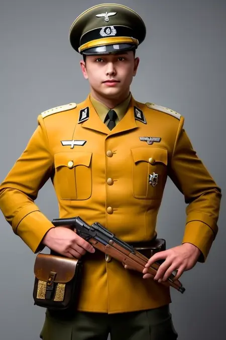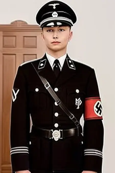 2. SS uniform: black, field grey, yellow... in colour, peaked, field, side cap with Eagle/swastika and skull emblems, red armband with swastika...epaulettes, (collar, sleeve, breast) insignia...