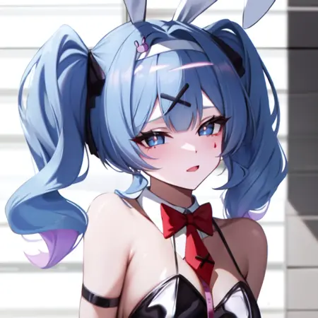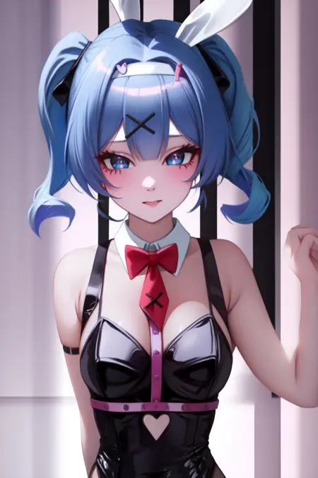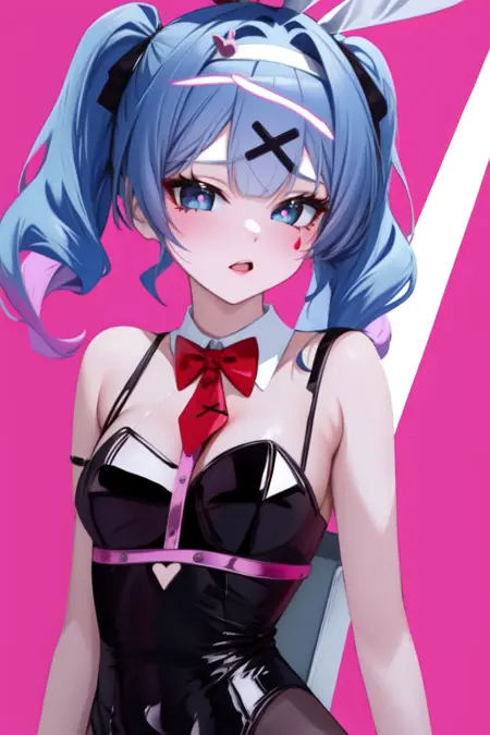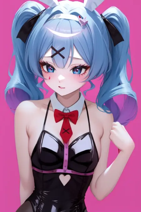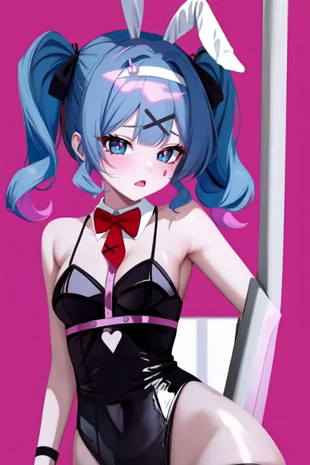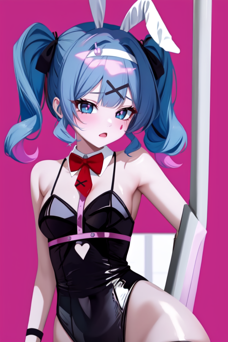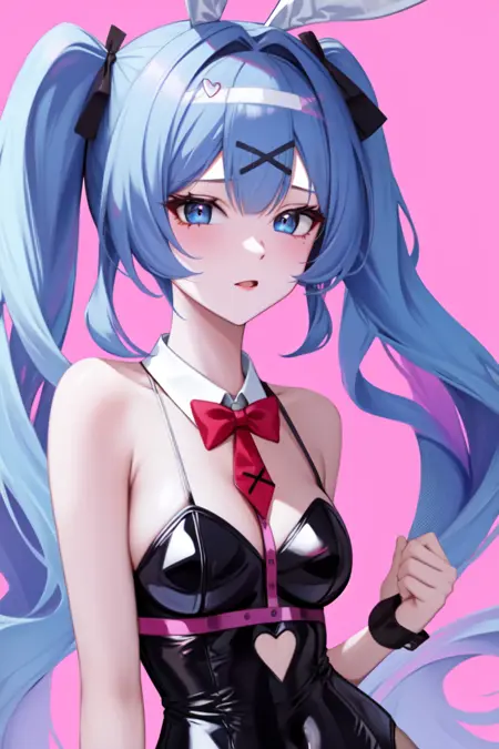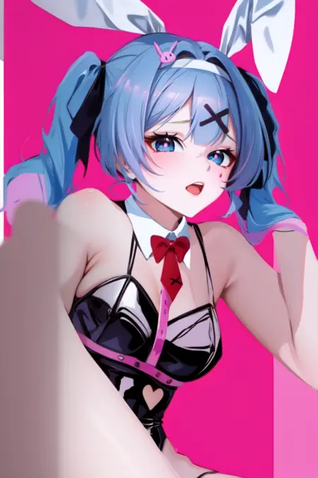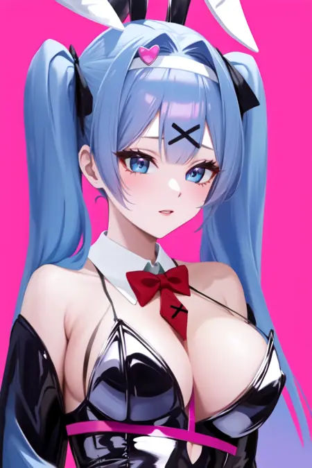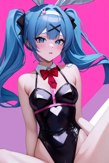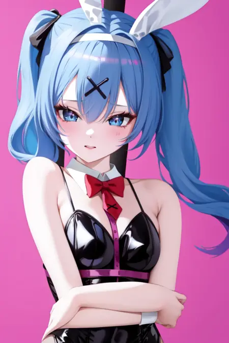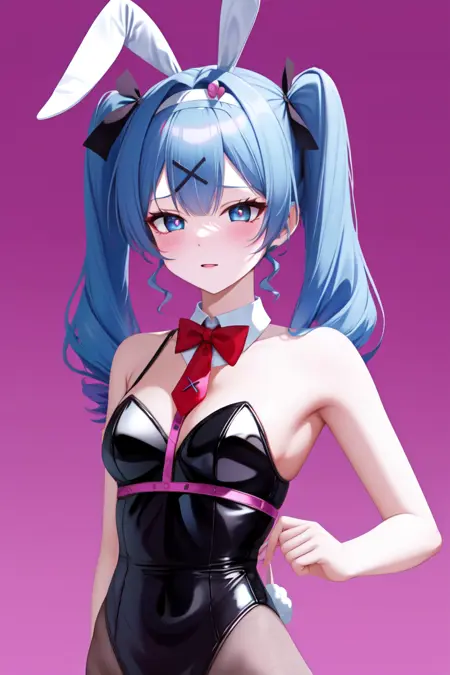 hatsune miku, hair ornament, blue hair, rabbit ears, playboy bunny, twintails, bangs, leotard, blue eyes, x hair ornament, detached collar
