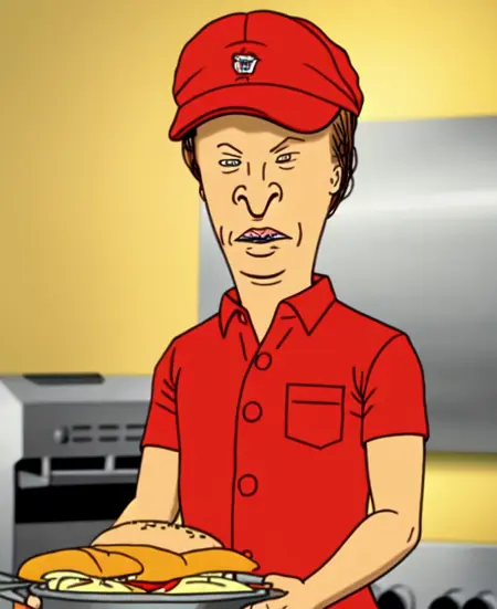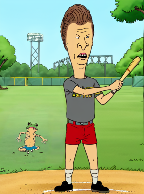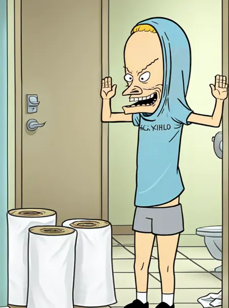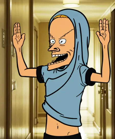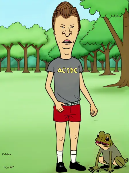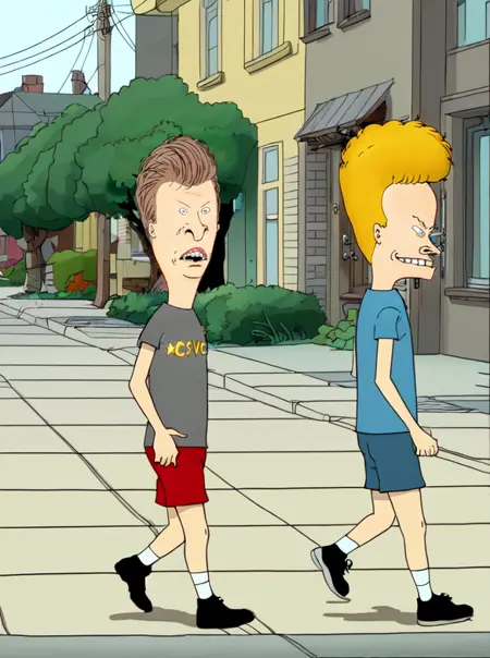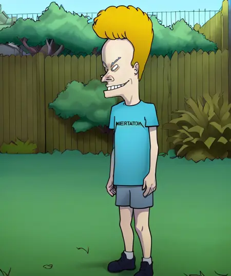 You can generate Beavis: 'beavis, blonde hair, smile, blue shirt, grey shorts, shoes, socks'
