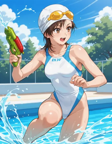 exdlsa, brown eyes, feather earrings, choker, fingerless gloves, camisole, shorts, beltexdlsa, brown eyes, feather earrings, necklace, fingerless gloves, torn shirt, green tank top, crop top, leather jacket, midriff, red belt, brown pantsexdlsa, brown eyes, one-piece swimsuit, goggles on head, (white one-piece swimsuit:0.4), (blue one-piece swimsuit:0.2), competition swimsuit, swim cap
