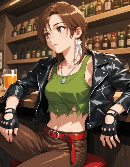 exdlsa, brown eyes, necklace, feather earrings, fingerless gloves, torn shirt, green tank top, leather jacket, midriff, belt, pants, crop top