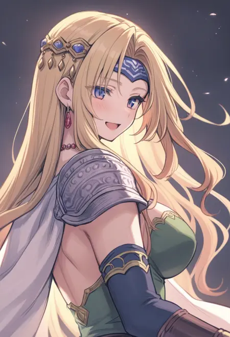 アレンジ衣装なので個々の好きなように要素を取捨選択して貰えばですが、サンプル絵はblonde hair, blue eyes, green leotard, headband, shoulder armor, large breasts, pauldrons, circlet, bridal gauntlets, belt, white cape, vambraces,bracer, shoulder pads, very long hair, bangs を入れて作成しています。