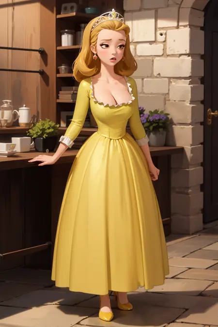 princess amber, brown eyes, blonde hair, yellow dress, princess, princess dress, tiara, 1girl, solo