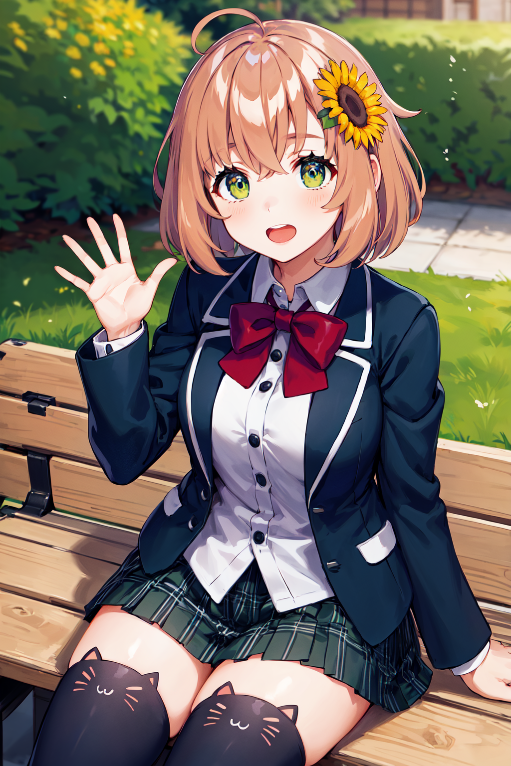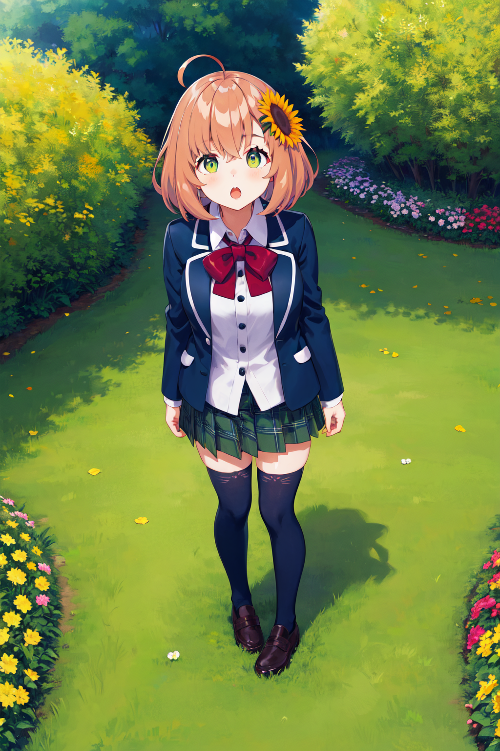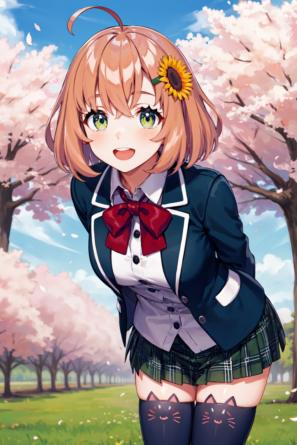 服装1aahimawari, short hair, ahoge, hair flower, school uniform, red bowtie, collared shirt, blazer, blue jacket, open jacket, long sleeves, plaid skirt, green skirt, black thighhighs