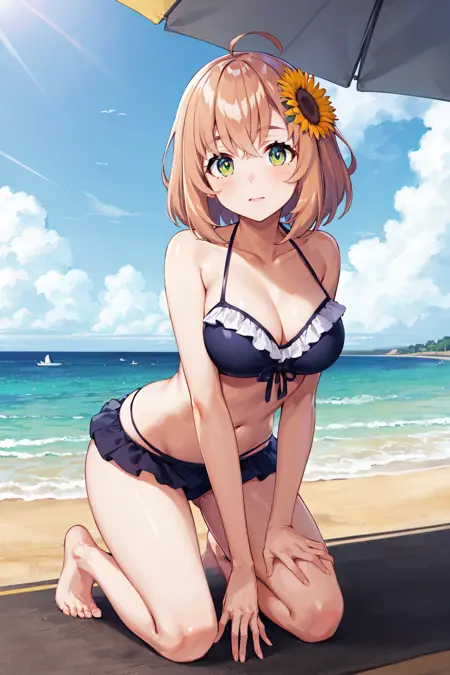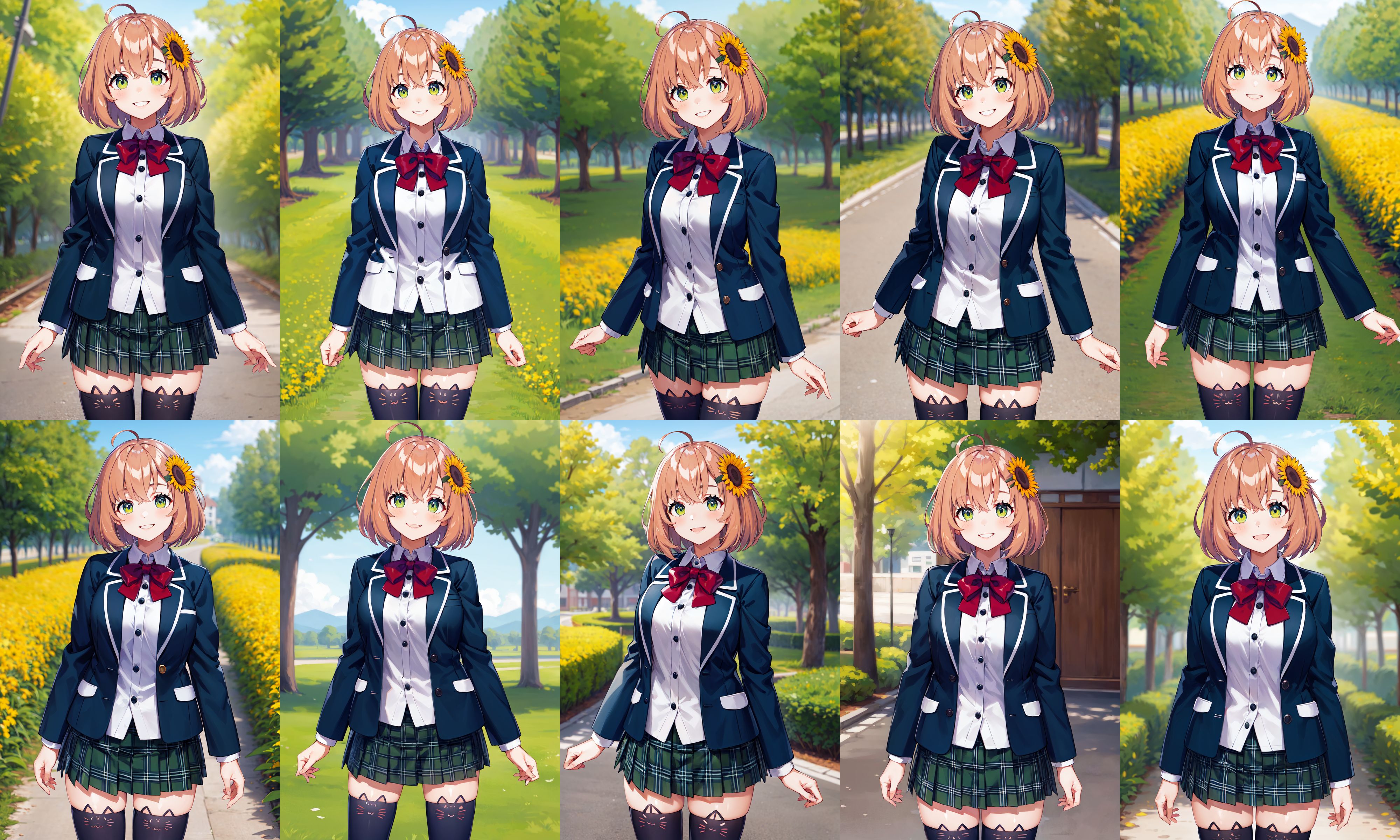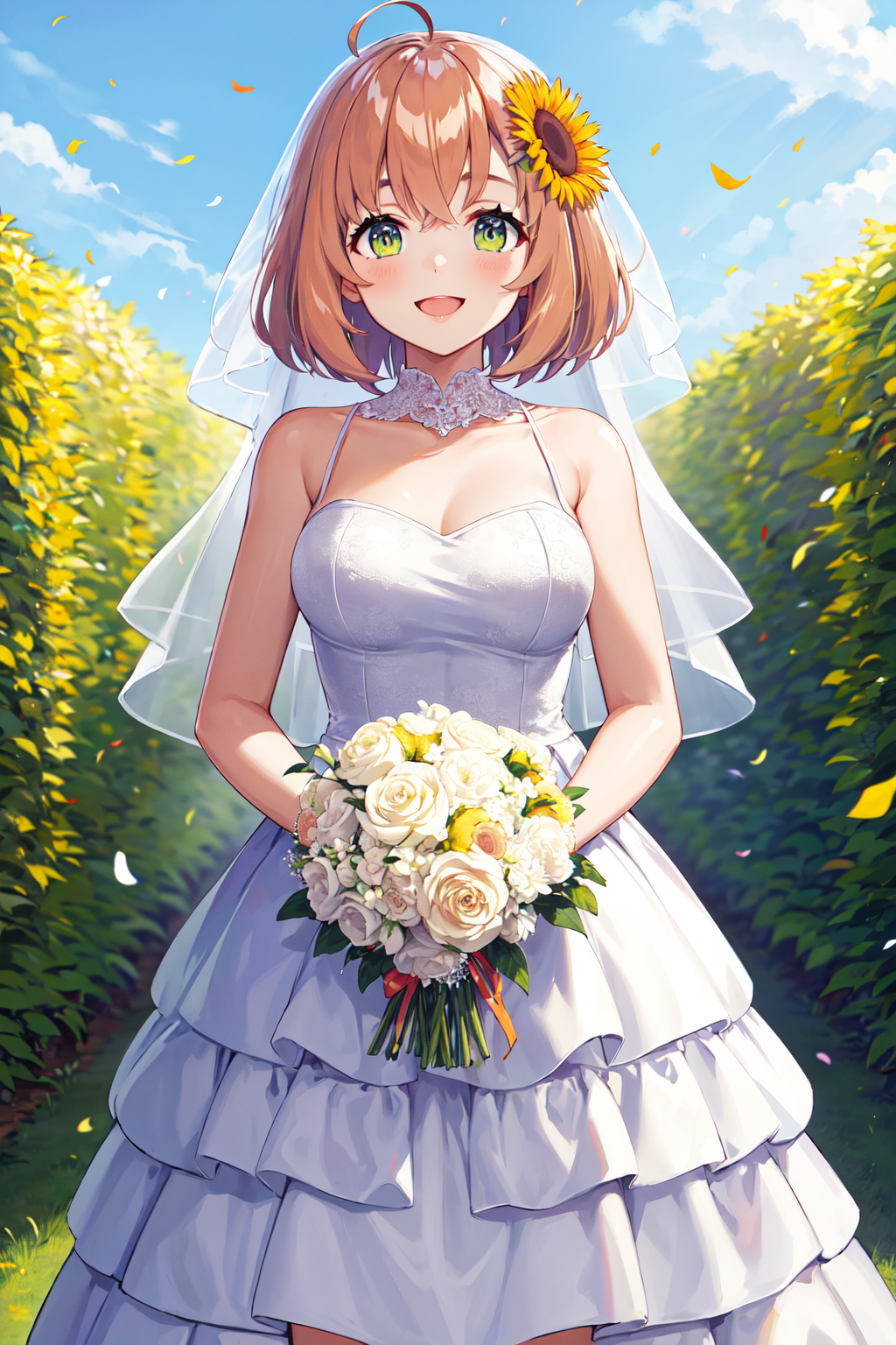 服装1aahimawari, short hair, ahoge, hair flower, school uniform, red bowtie, collared shirt, blazer, blue jacket, open jacket, long sleeves, plaid skirt, green skirt, black thighhighs