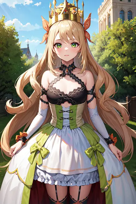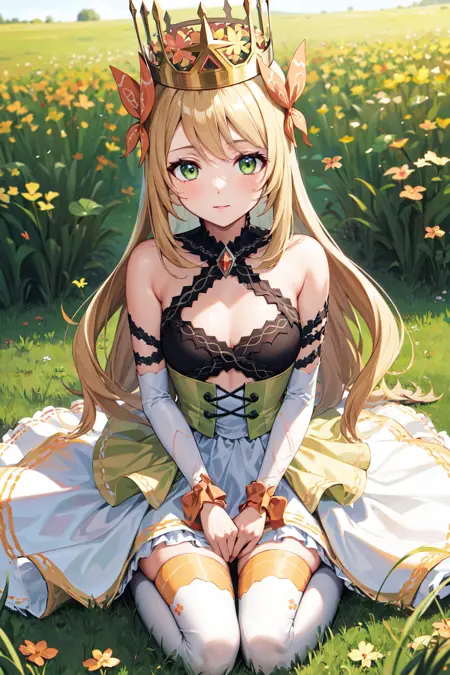 服装1aaceline, long hair, crown, hair ornament, green eyes, breasts, bare shoulders, dress, detached sleeves, bow, white thighhighs