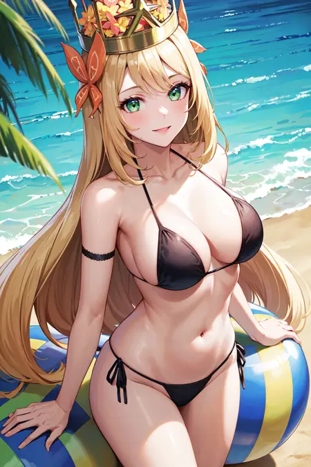 衣装1aaceline, long hair, crown, hair ornament, green eyes, breasts, bare shoulders, dress, detached sleeves, bow, white thighhighs