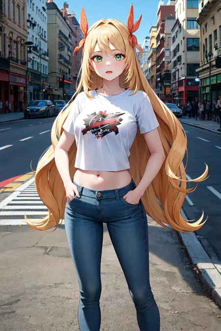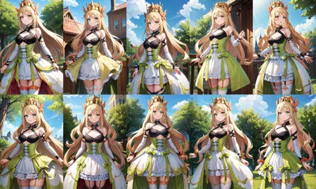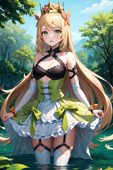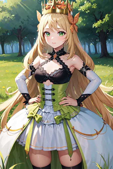 outfit1aaceline, long hair, crown, hair ornament, green eyes, breasts, bare shoulders, dress, detached sleeves, bow, white thighhighs
