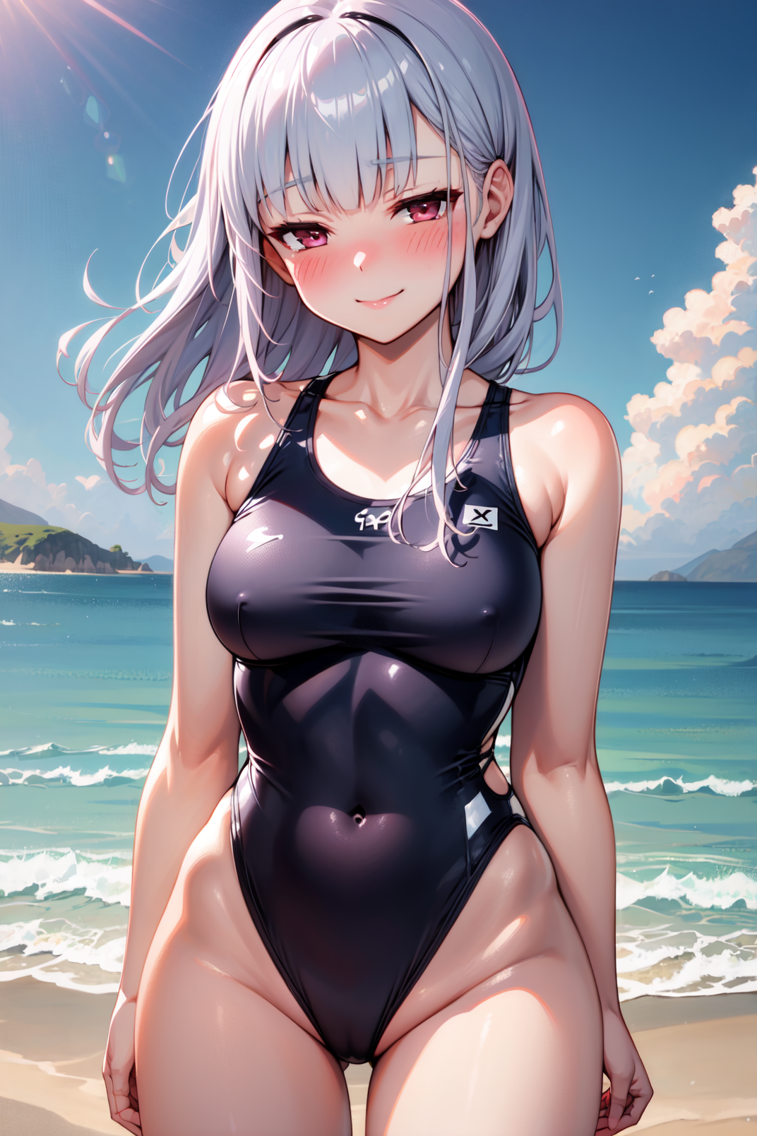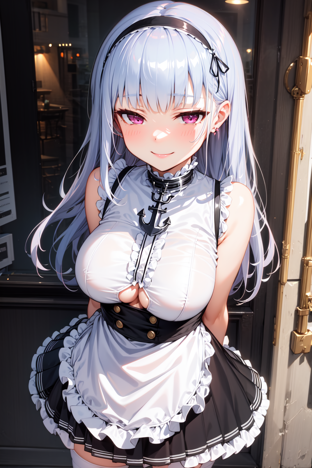 outfit: hairband, earrings, anchor choker, metal wrist cuffs, sleeveless shirt, underboob cutout, waist apron, frilled apron, black skirt, frilled skirt, white thighhighs, shoes