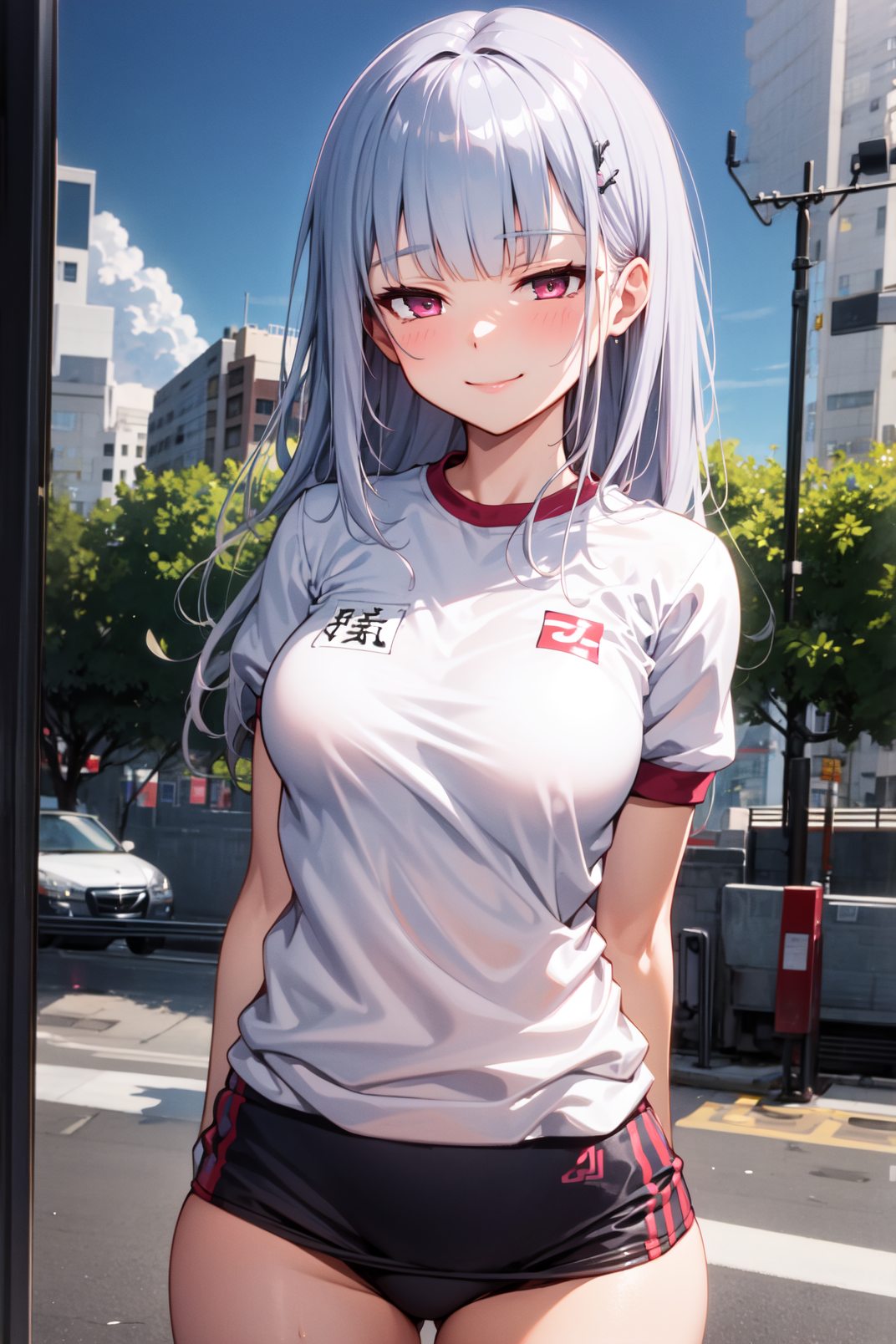 appearance: dido, pink eyes, gray hair, long hair, blunt bangs