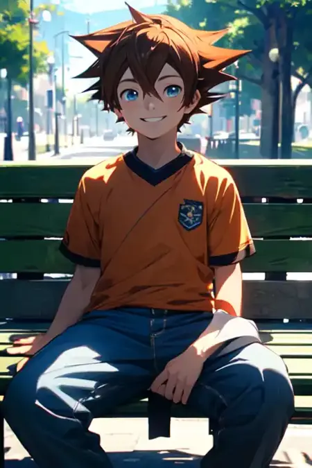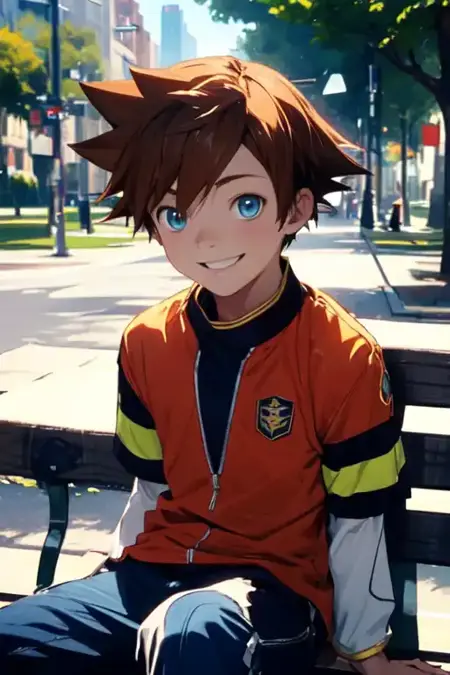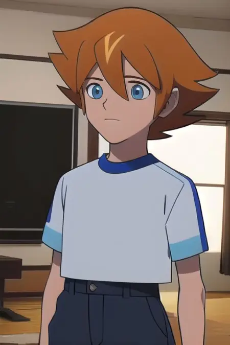 Chris Thorndyke from Sonic X, trigger words are "Chris Thorndyke, 1boy, spiky brown hair, red shirt, blue pants"