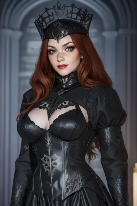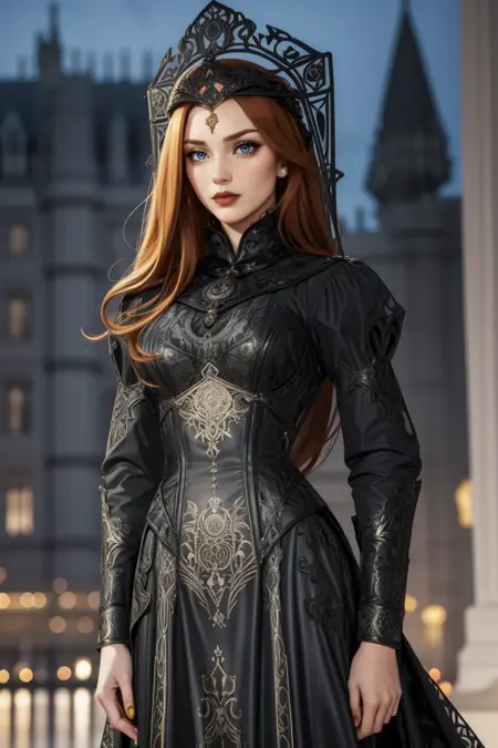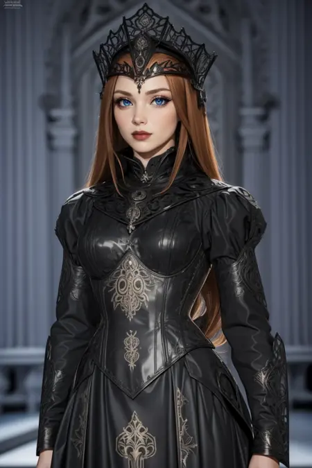 关键词:HUD_Evl_Qn、妆容、口红、黑色长裙、头饰、高领、颈饰、激光切割、精细雕刻的束腰、长袖、靴子