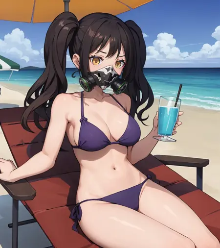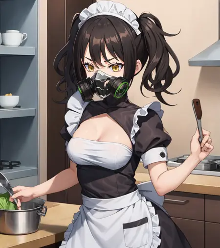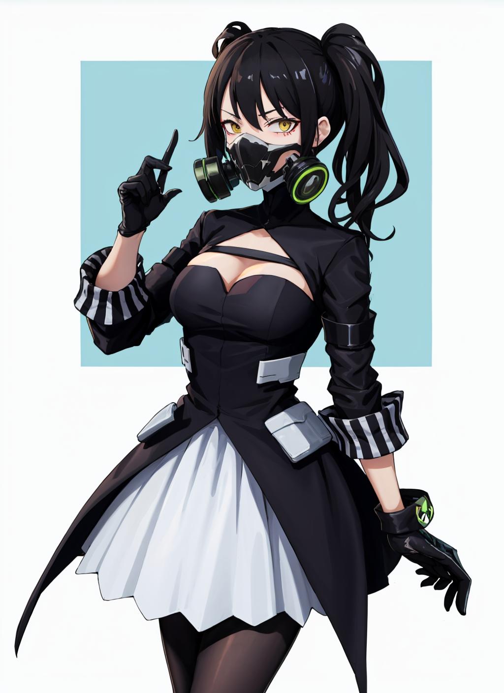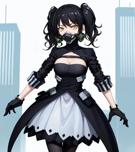 scarecrownormal, 가스 마스크, 절개 선, 검은 드레스, 팬티스타킹, 소매 커프스, 검은 장갑, 산그비스 페리, 검은색과 흰색 스커트