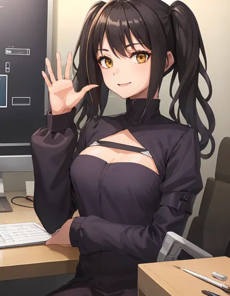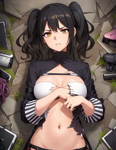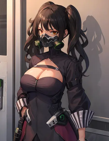 scarecrownormal, gas mask, cleavage, black dress, pantyhose, sleeve cuffs, black gloves, sangvis ferri, black and white skirt