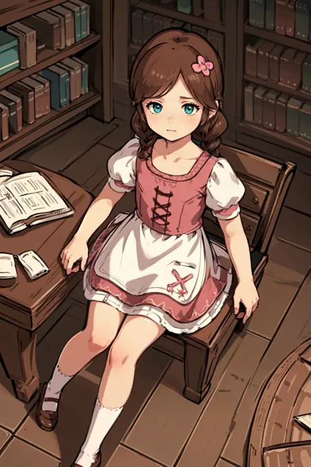SD1.5: teal eyes, corset, brown hair, swept bangs:1.5), twin braids, (hair flower, hair ornament:1.1), collarbone, low collar, (pink and white dress:1.2), pink skirt, flower pattern, short sleeves, white sleeves, white apron, puffy sleeves, white socks, bobby socks, brown footwear, mary janes, freckles on cheeks and nose, (tareme:1.5),