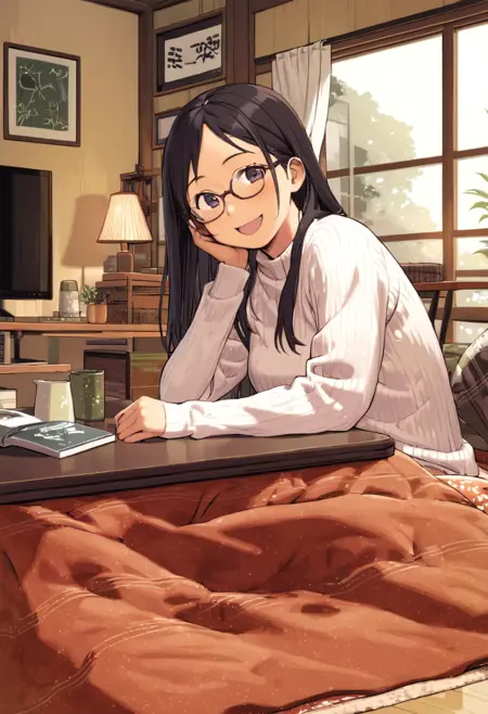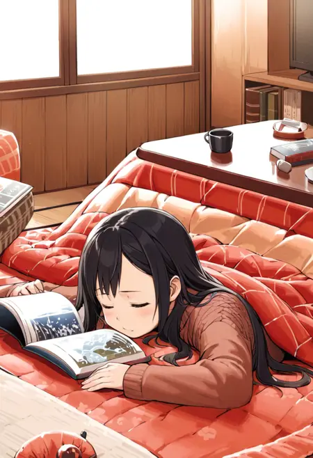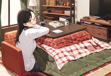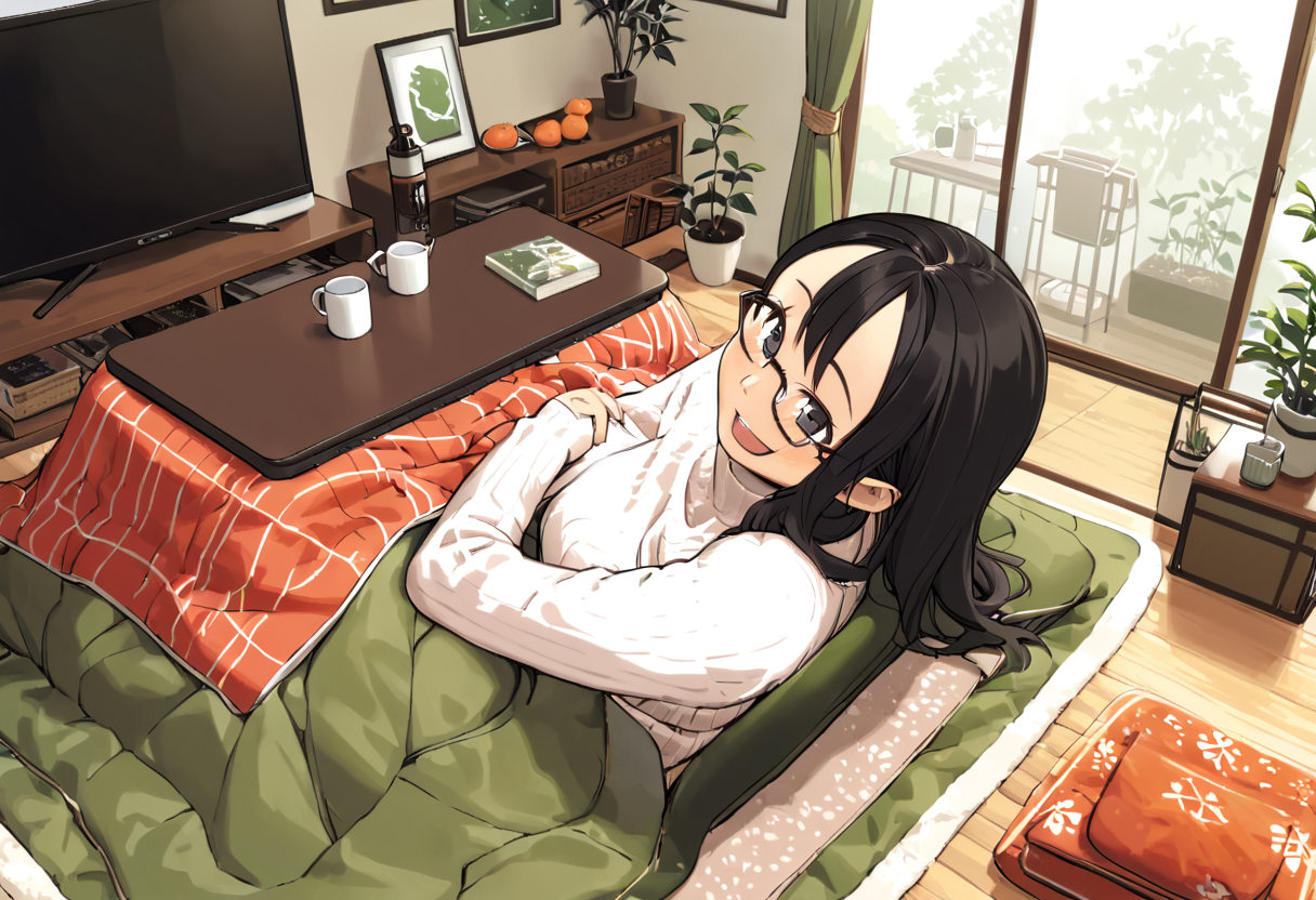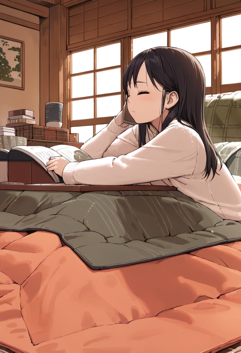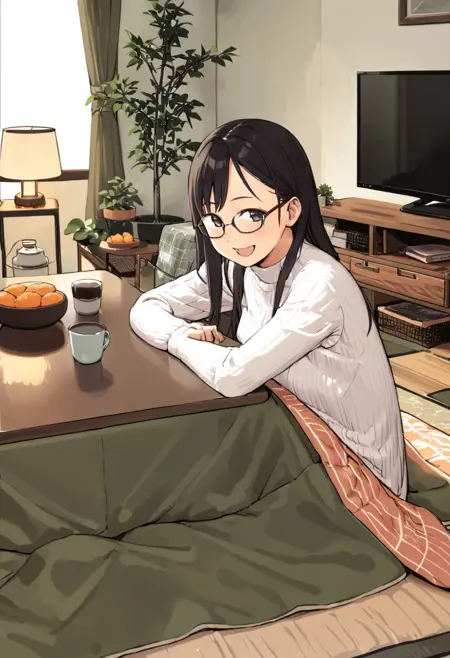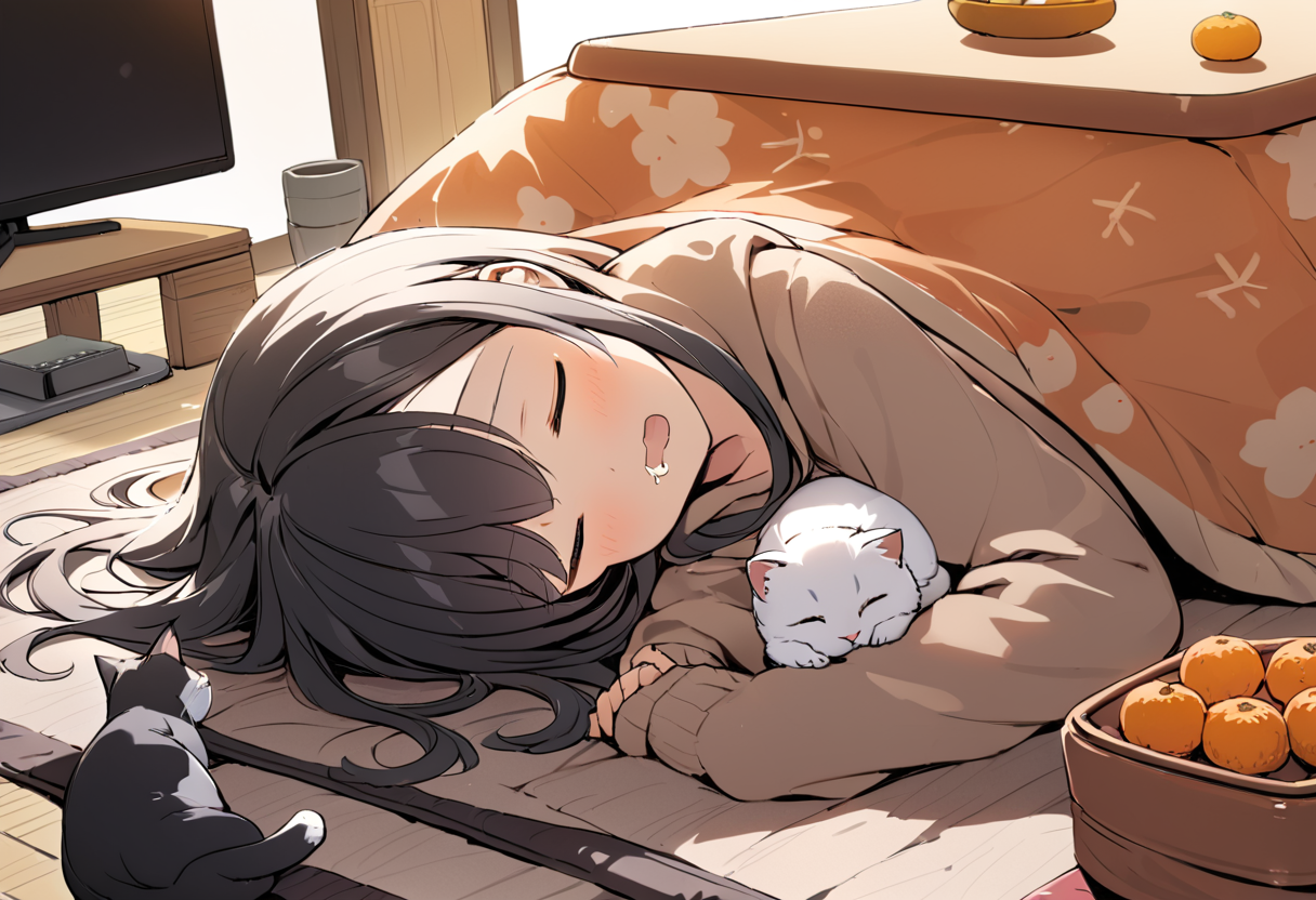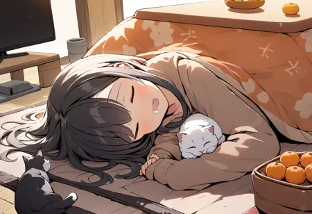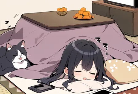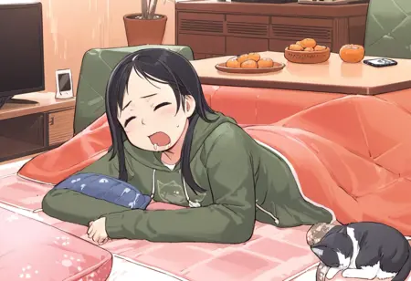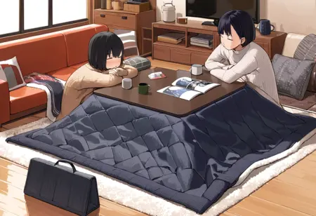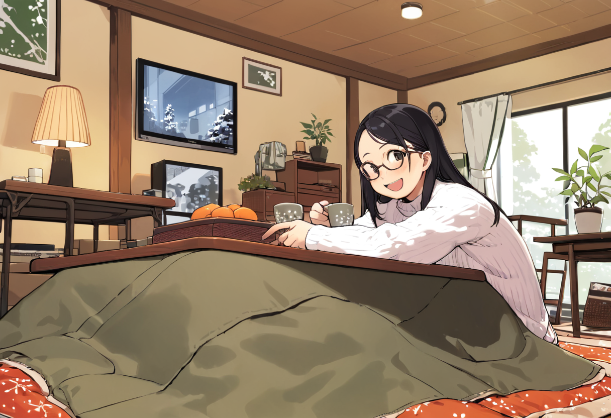 This is LoRA, which could possibly illustrate a living room-like landscape with a kotatsu, a Japanese winter heating device. これは日本の冬の暖房機器、こたつのある居間っぽい風景のイラストをもしかすると描くことができるかもしれないLoRAです。
