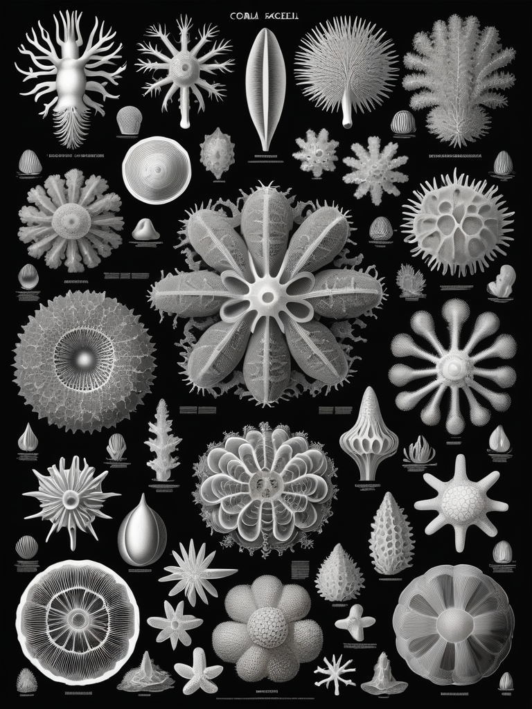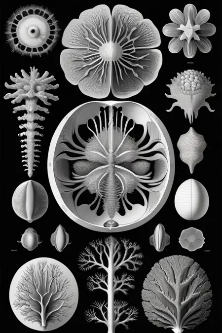 A model trained off Ernst Haeckel's Artforms in Nature grayscale art. Trained in 512x768.