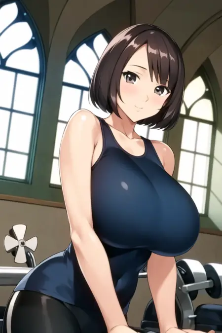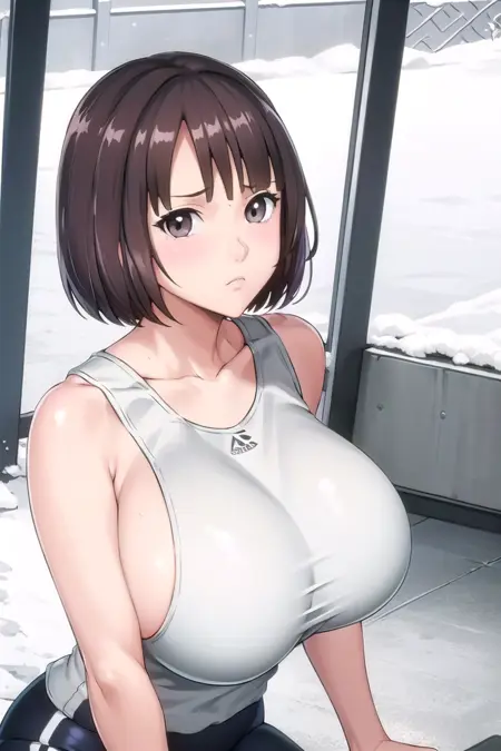 trigger words: short hair, bob cut, bangs, (asymmetrical bangs), brown hair, (black hair:0.6), (brown eyes), lips, huge breasts