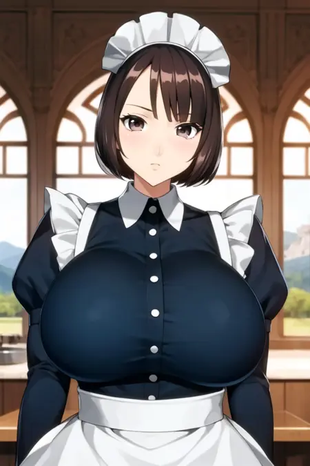 トリガー語:ショートヘア、ボブカット、前髪、(非対称前髪)、茶髪、(黒髪:0.6)、(茶色の目)、唇、巨大な胸