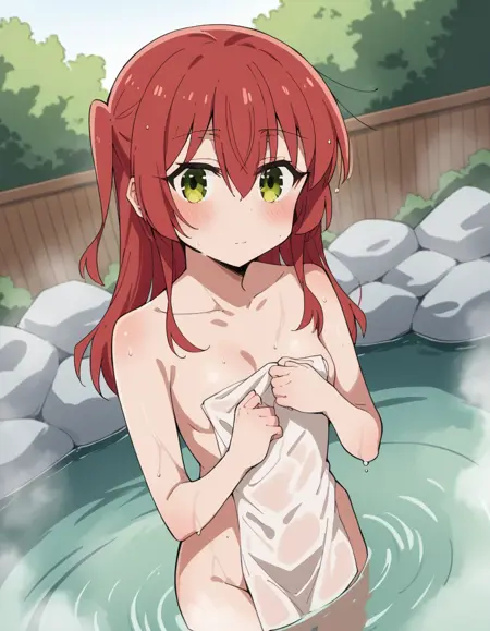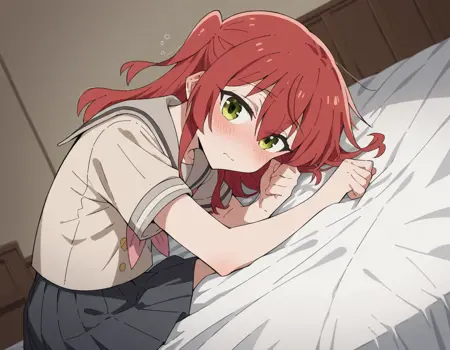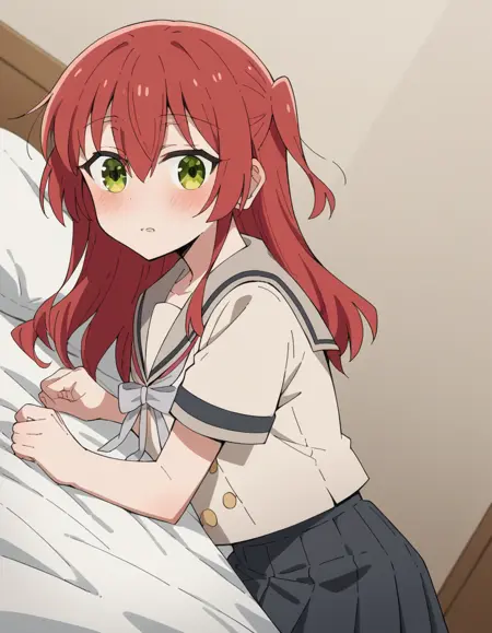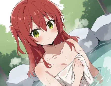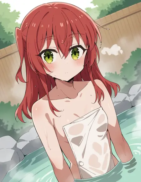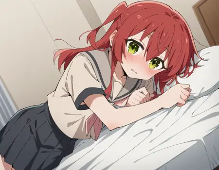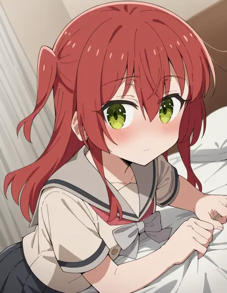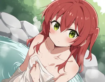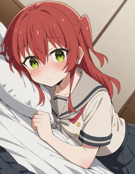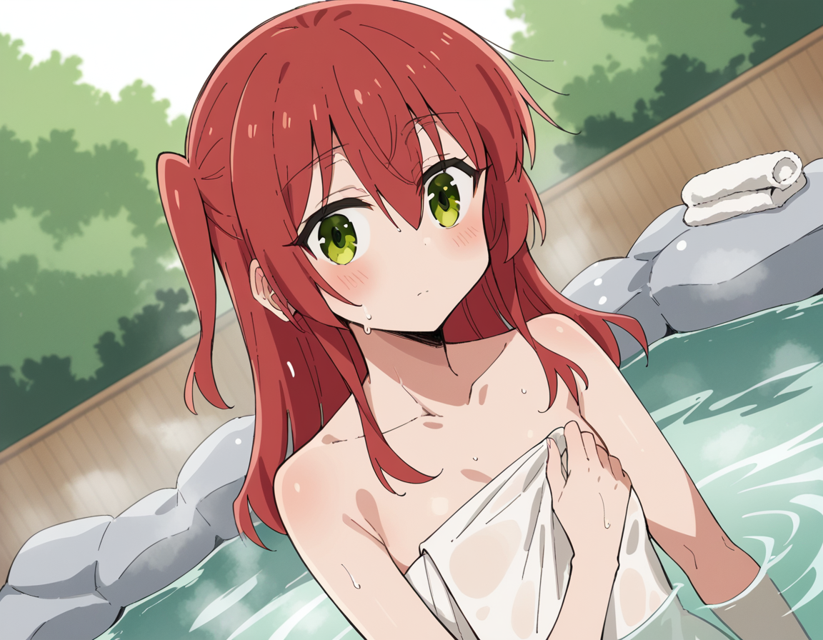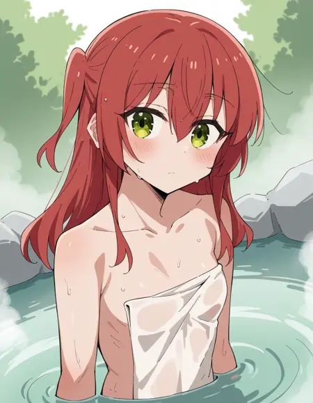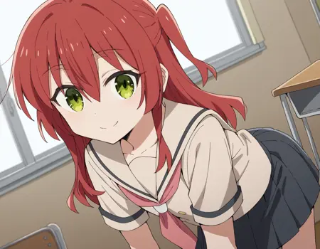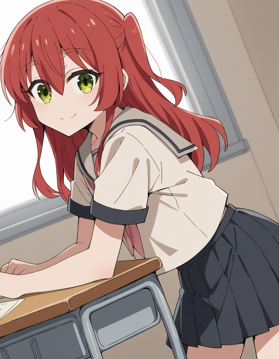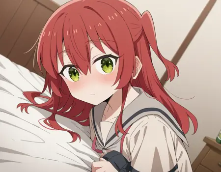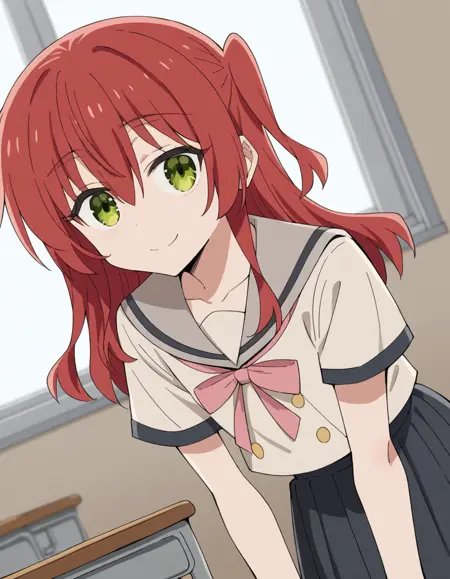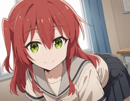 ikuyo kita, green eyes, hair between eyes, long hair, one side up, red hair,