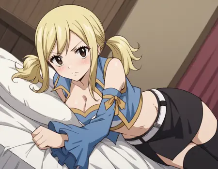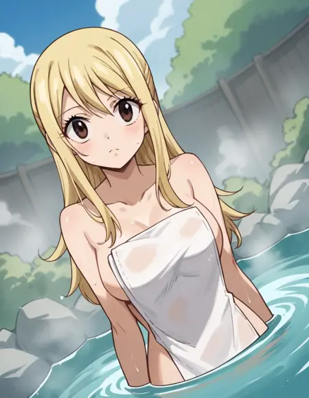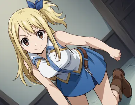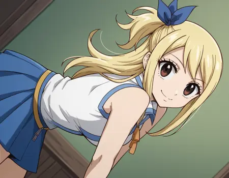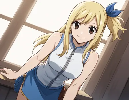 lucy heartfilia, blonde hair, brown eyes, one side up, ribbon, hair ribbon, blue ribbon, long hair,