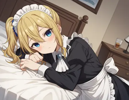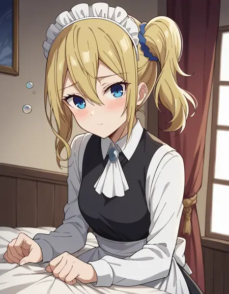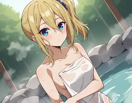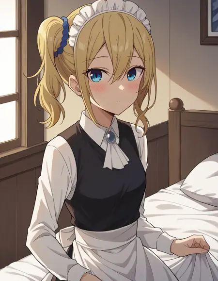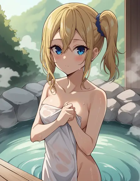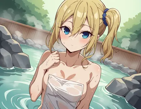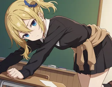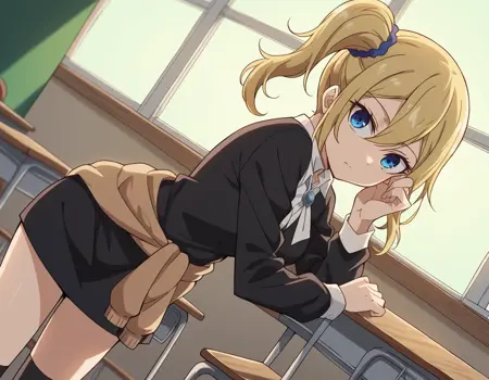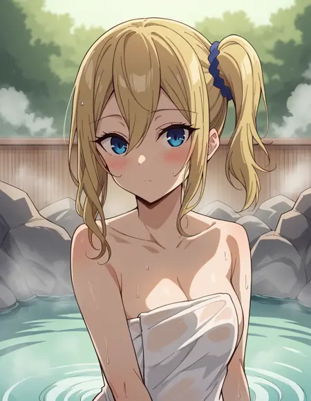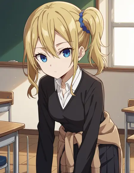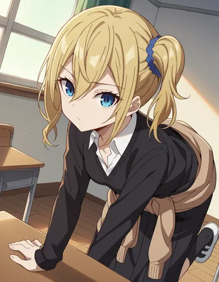 ai hayasaka, bangs, blue eyes, blonde hair, hair ornament, hair between eyes, sidelocks, side ponytail, scrunchie, hair scrunchie, blue scrunchie,