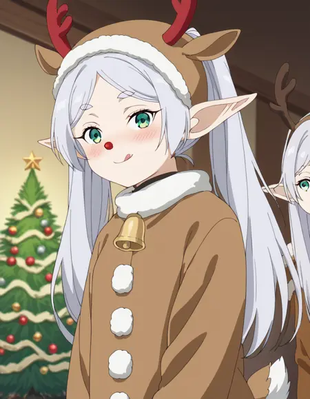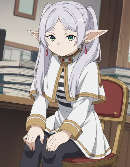 frieren, long hair, twintails, green eyes, grey hair, pointy ears, elf,