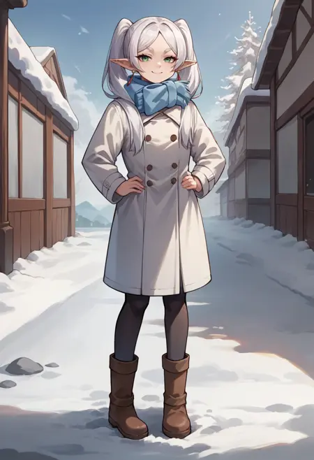 FrierenWinter, green eyes, white hair, long hair, twintails, earrings, blue scarf, white coat, black pantyhose, brown boots