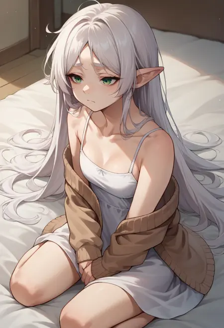 FrierenSleepwear, green eyes, white hair, long hair, messy hair, white dress, spaghetti straps, sleeveless dress, brown cardigan