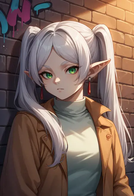 Frieren, green eyes, white hair, long hair, twintails, thick eyebrows, earrings