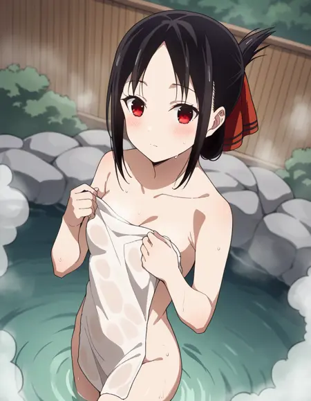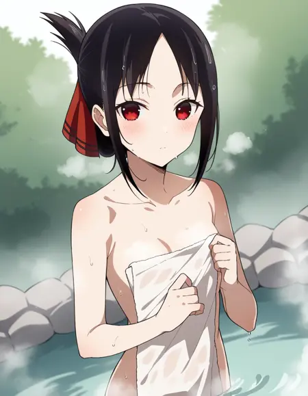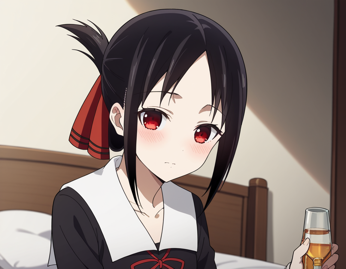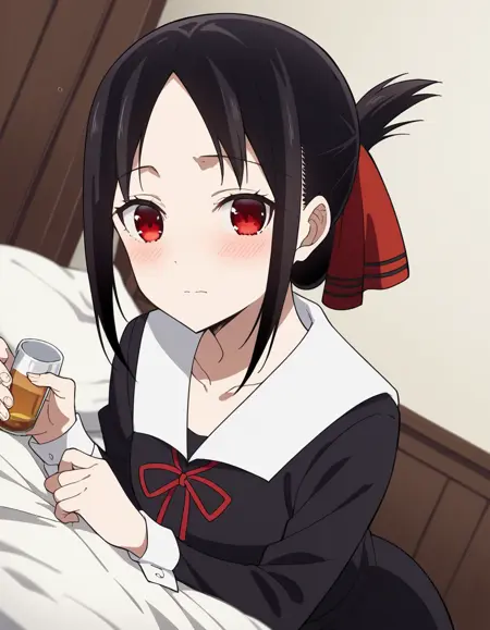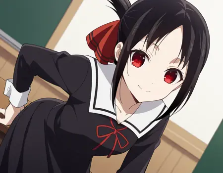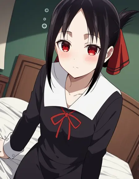 kaguya shinomiya, short hair, bangs, black hair, red eyes, hair ribbon, sidelocks, folded ponytail, parted bangs,