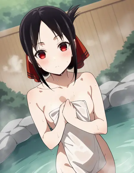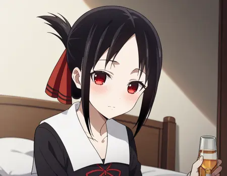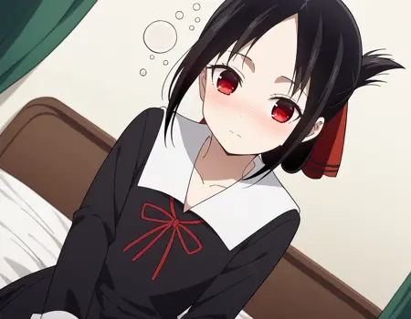 카구야 시노미야, 단발, 앞머리, 검은 머리, 붉은 눈, 머리 끈, 측면 머리카락, 접힌 포니테일, 갈라진 앞머리,
