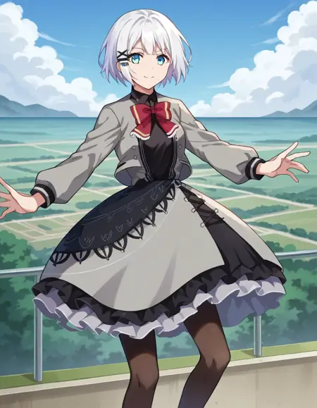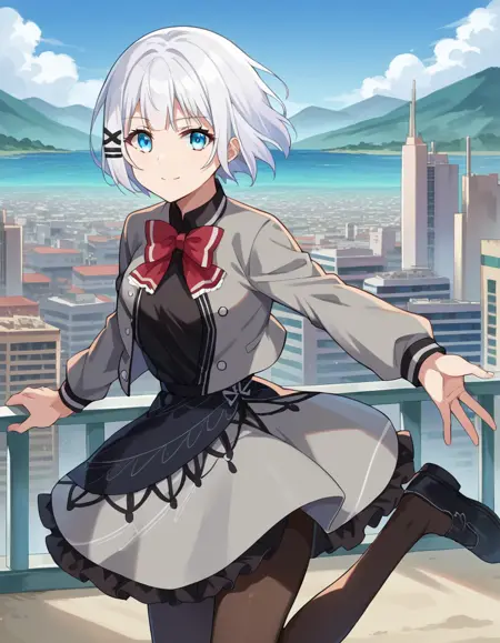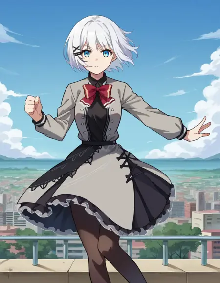 ドレス、リボン、ネクタイ、赤いリボン、赤いネクタイ、シャツ、長袖、ジャケット、タイツ、フリル、靴、灰色のジャケット、開いた服、黒いシャツ、
