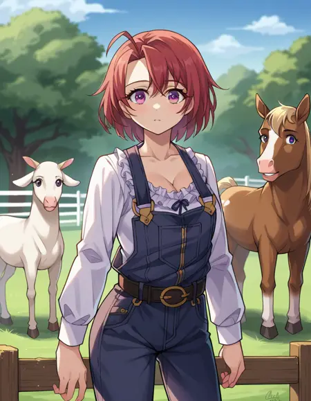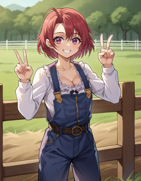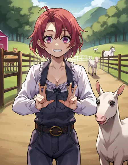 cow girl, ahoge, red hair, purple eyes, short hair,