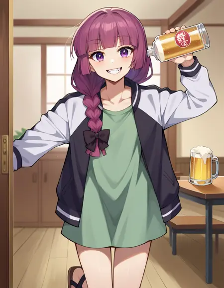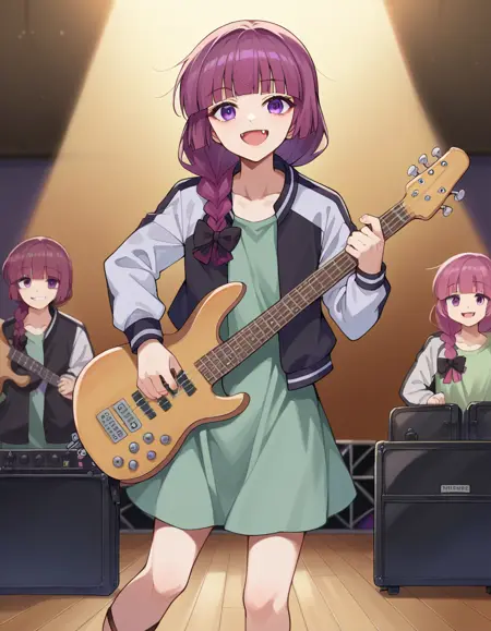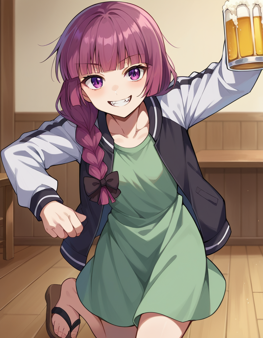 kikuri hiroi, black bow, blunt bangs, braid, closed eyes, purple eyes, fang, hair bow, hair over shoulder, long hair, purple hair, sidelocks, single braid, fangs,