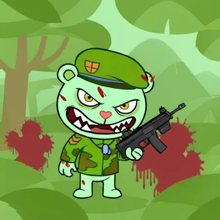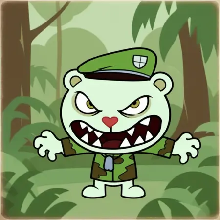 Flippy is a green male bear. He wears dog tags around his neck and a green beret with a checkered crest on his head. He is a retired veteran soldier in the Army. He fought in the Weaponized Animal Regiment (The W.A.R), and has an obsession with making booby traps inspired by the Viet Cong, as well as a flashback of his experience of being held captive by them.