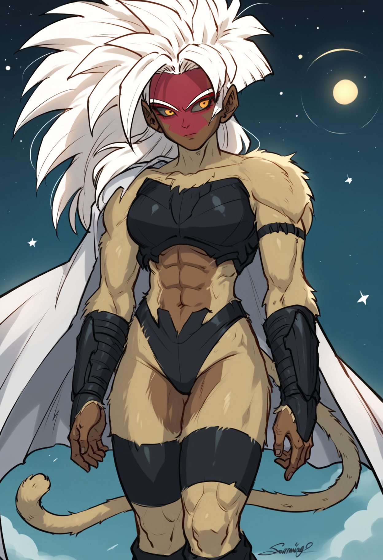提示词为:森托赛亚人,体毛,金色毛发,深色皮肤,深肤色,白发,黑色眼白,黄色眼睛,金色猴子尾巴,红色脸绘