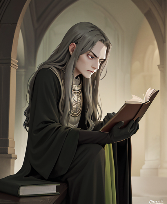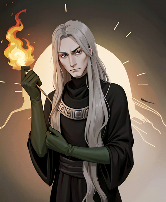 black robe, green gloves, necklace
