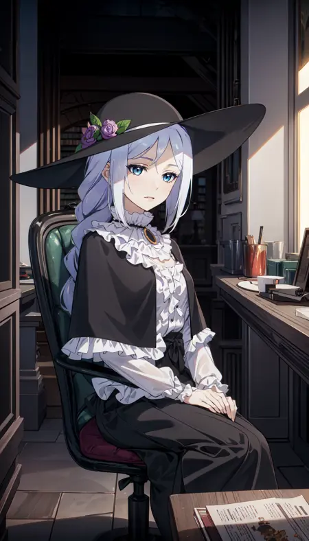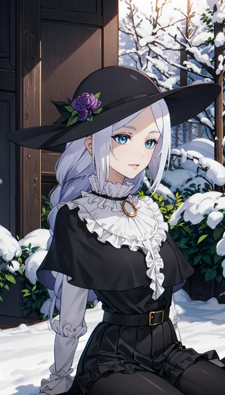 purple hair, single braid, blue eyes, black hat, black dress, frills, capelet