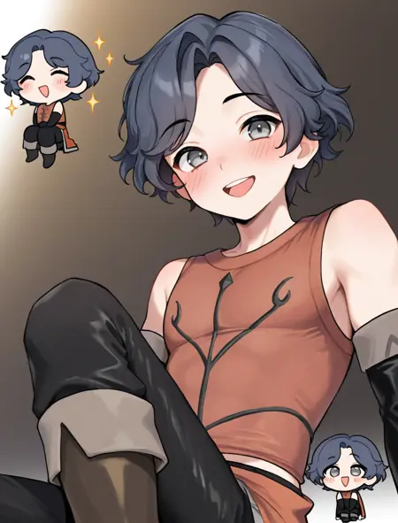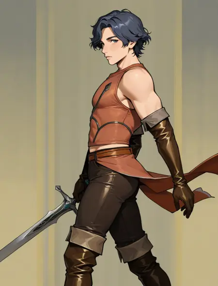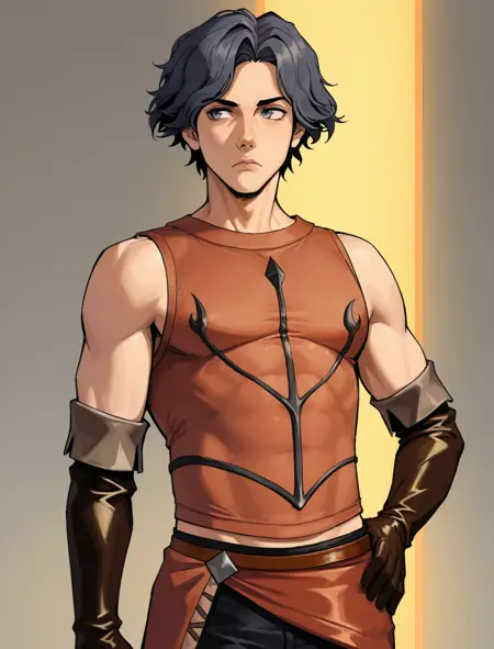 brown shirt, sleeveless shirt, belt, black gloves, black pants