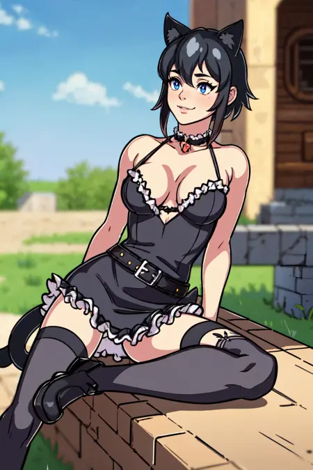 Trigger Cat : 1girl, short hair, cat, bow, frills, black gloves, belt, black thighhighs, cat ears, footwear, cat tail, frilled dress, neck bell, bracelet