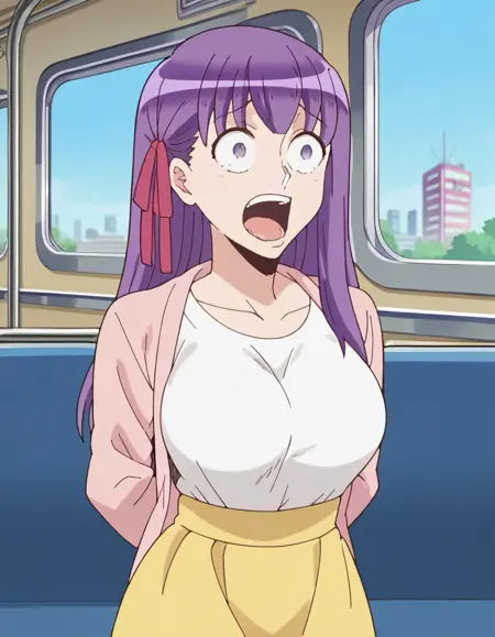 sakura matou, long hair, purple eyes, purple hair, ribbon, hair ribbon, red ribbon,