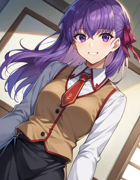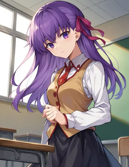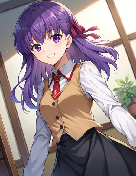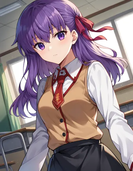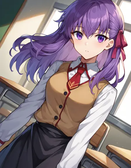 sakura matou, long hair, purple eyes, purple hair, ribbon, hair ribbon, red ribbon,