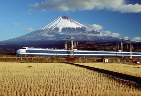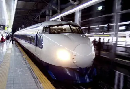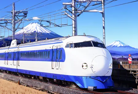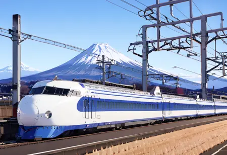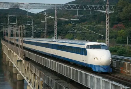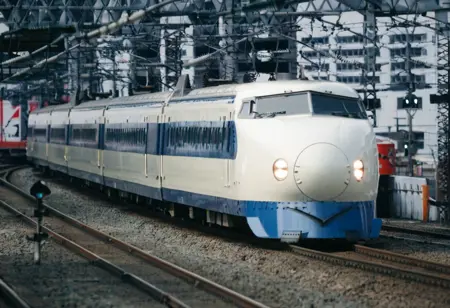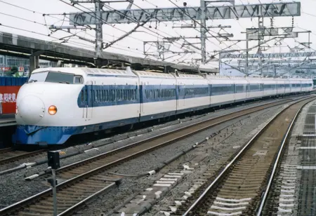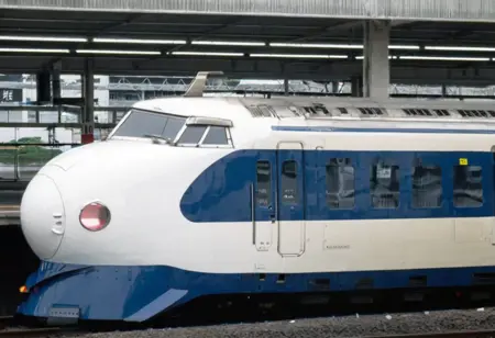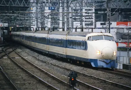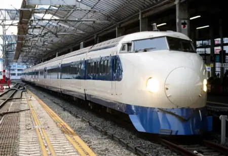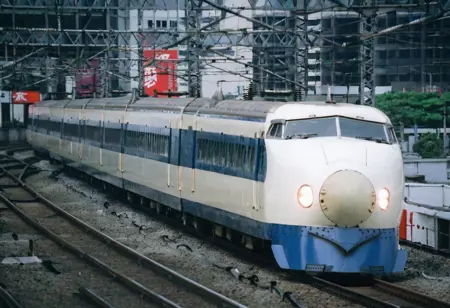 shinkansen type0, train, outdoors, vehicle focus, train station, scenery, real world location, window, realistic, building, headlight