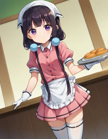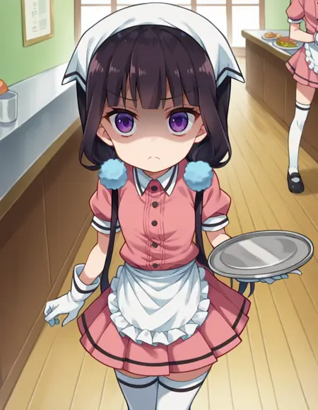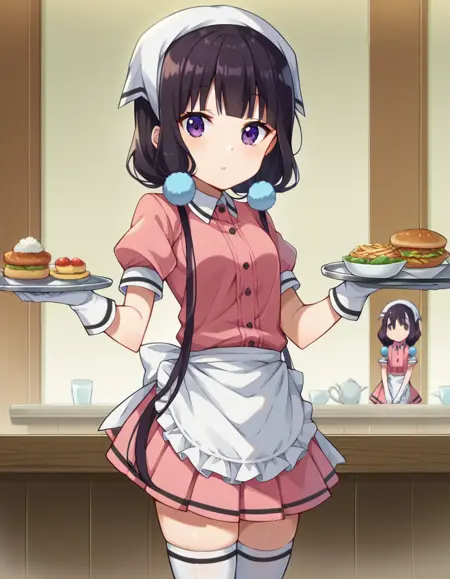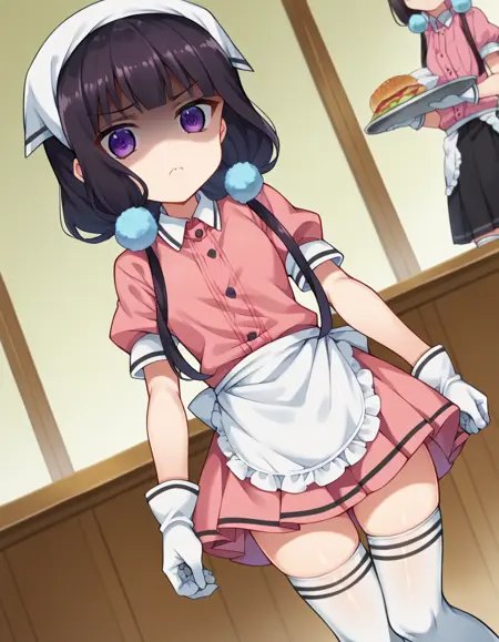 skirt, shirt, thighhighs, gloves, short sleeves, pleated skirt, frills, shoes, puffy sleeves, white gloves, black footwear, uniform, apron, white thighhighs, puffy short sleeves, zettai ryouiki, waist apron, white apron, pink skirt, pink shirt, frilled apron, waitress, head scarf,