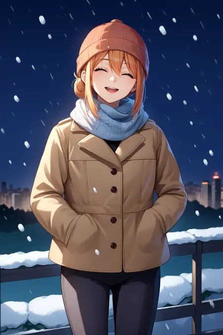 服装:タートルネックセーター、ジーンズ