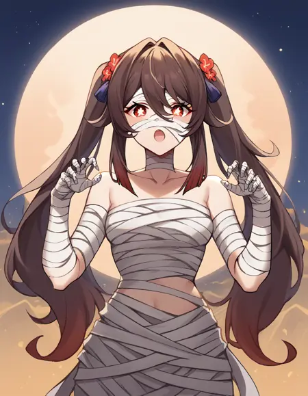 hutao, long hair, bangs, brown hair, red eyes, hair between eyes, twintails, sidelocks, symbol-shaped pupils,