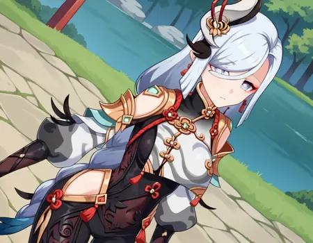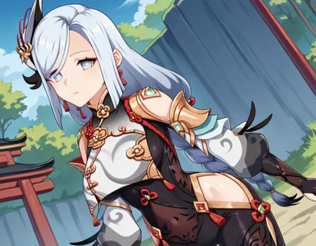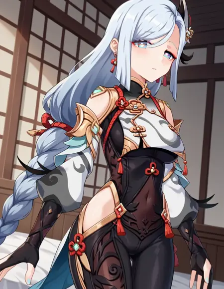 | 训练词汇 | shenhe, blue eyes, braided ponytail, earrings, eyelashes, eyeliner, eyes visible through hair, eyeshadow, hair between eyes, makeup, red eyeshadow, sidelocks, single earring, symbol-shaped pupils, tassel, tassel earrings, white hair, long hair,已复制! arm support, bare shoulders, black bodysuit, black gloves, bodysuit, breast curtain, chinese knot, clothing cutout, covered navel, detached sleeves,gloves, gold trim, hip vent, jewelry, long sleeves, partially fingerless gloves, puffy detached sleeves, puffy long sleeves, puffy sleeves, shoulder cutout, side cutout, stomach cutout, thigh cutout, white sleeves,已复制! |